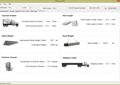At Delta Precast, we’ve developed and licensed our own DP Beam software specifically designed to analyze each beam based on live load design truck, wearing surface, future wearing surface, sidewalk loads and railings conditions. Other features of our DP Beam software include: