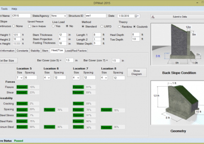 At Delta Precast, we’ve developed and licensed our own DP Wall software specifically designed to analyze each structure based on live load, retained depth and water table depth conditions. The program will also continually tell users if the design is adequate through a series of red and green indicator fields. Other features of our DP Wall software include: