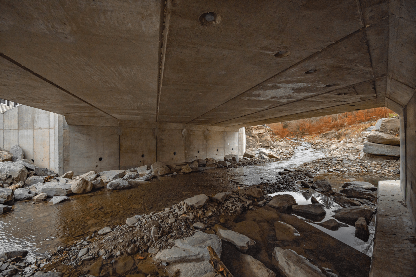 This project consisted of construction of a new three-sided precast concrete structure. The scope of work included cast in place concrete footings, wingwalls, headwalls, associated earthwork, road construction, and guide rails. Removal of an existing temporary bridge was also part of the project tasks.