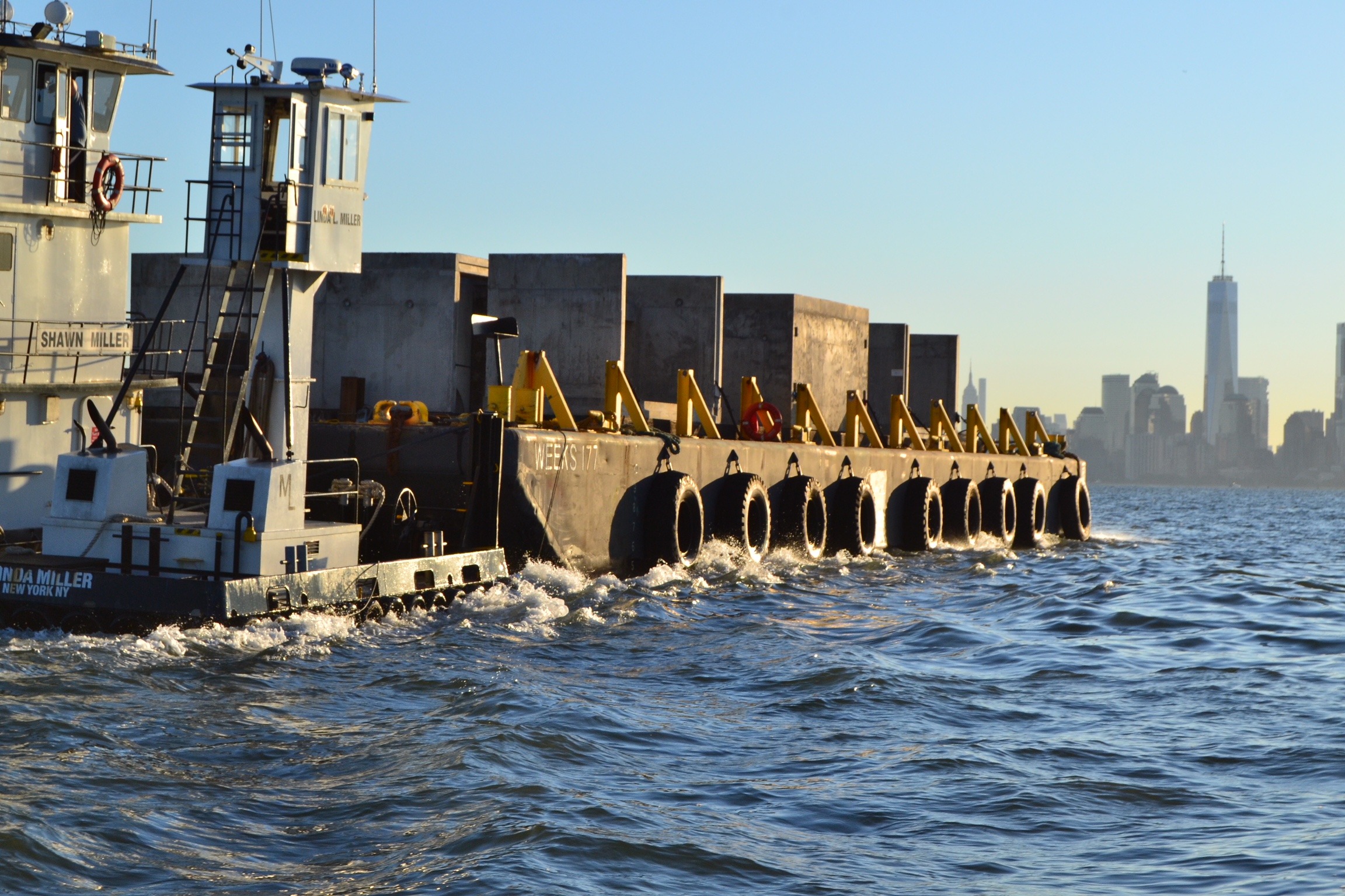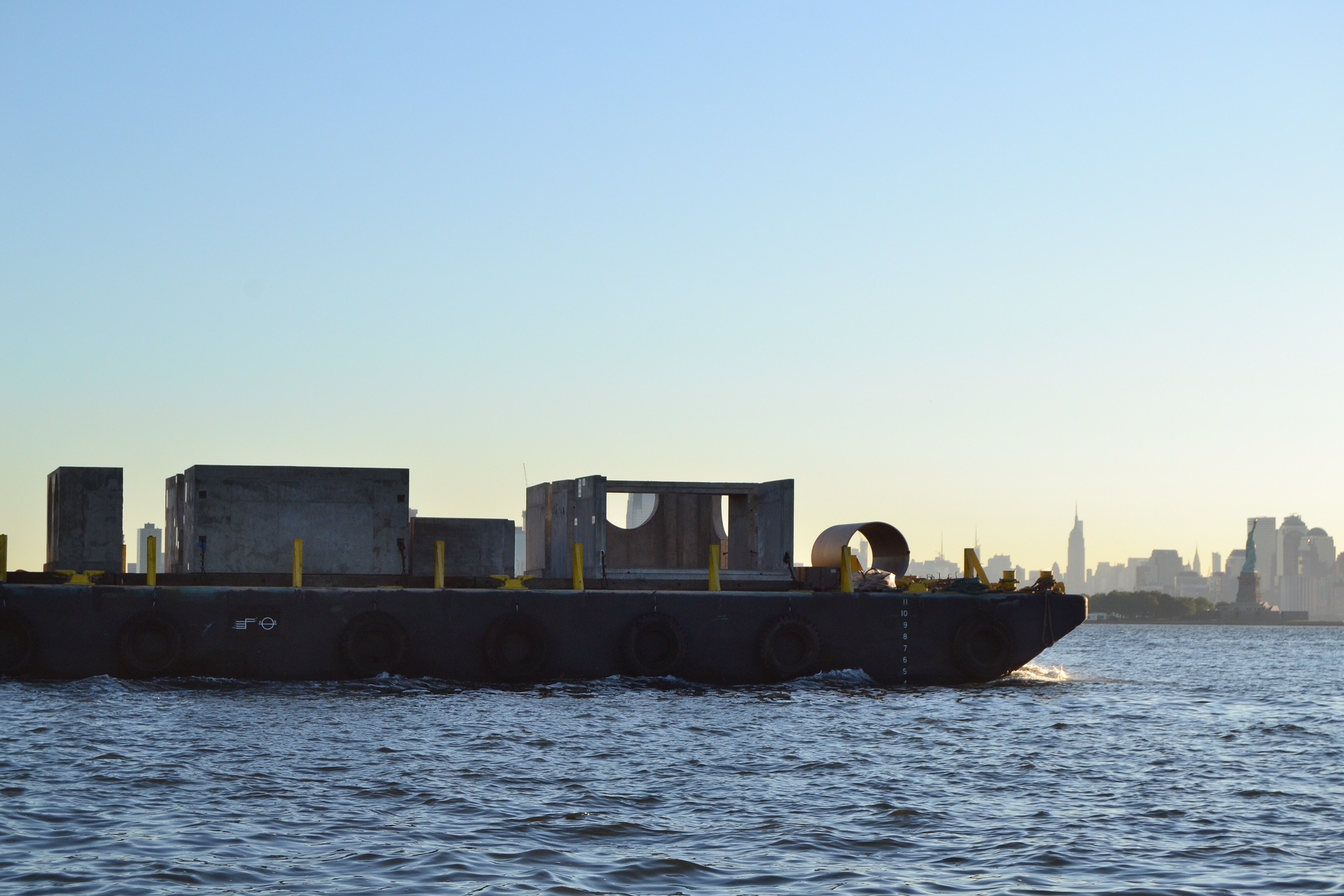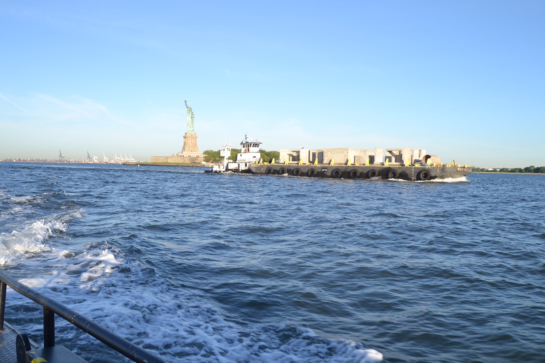 The first 11 elements were shipped via truck to a New Jersey shipyard. From there, a barge with a 100-ton revolving crane, loaded the pieces in sequence onto another barge, taking due caution to balance the total weight.