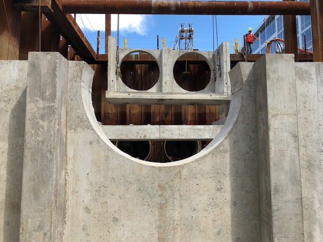Each chamber took six weeks to fabricate and measured 16-feet-by-48-feet-by-16-feet tall, weighing approximately 300,000 pounds. Garden State Precast fabricated 11 elements for each chamber – 22 elements altogether, ranging in weight from 33,000 pounds to 83,500 pounds.
