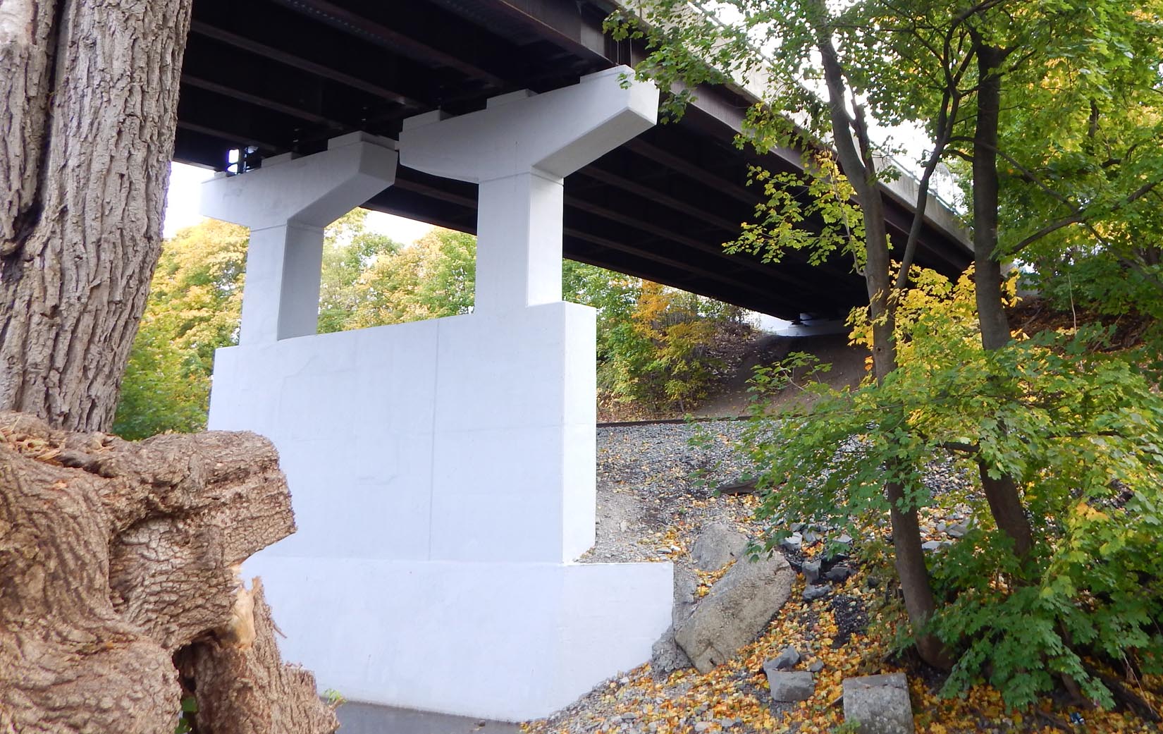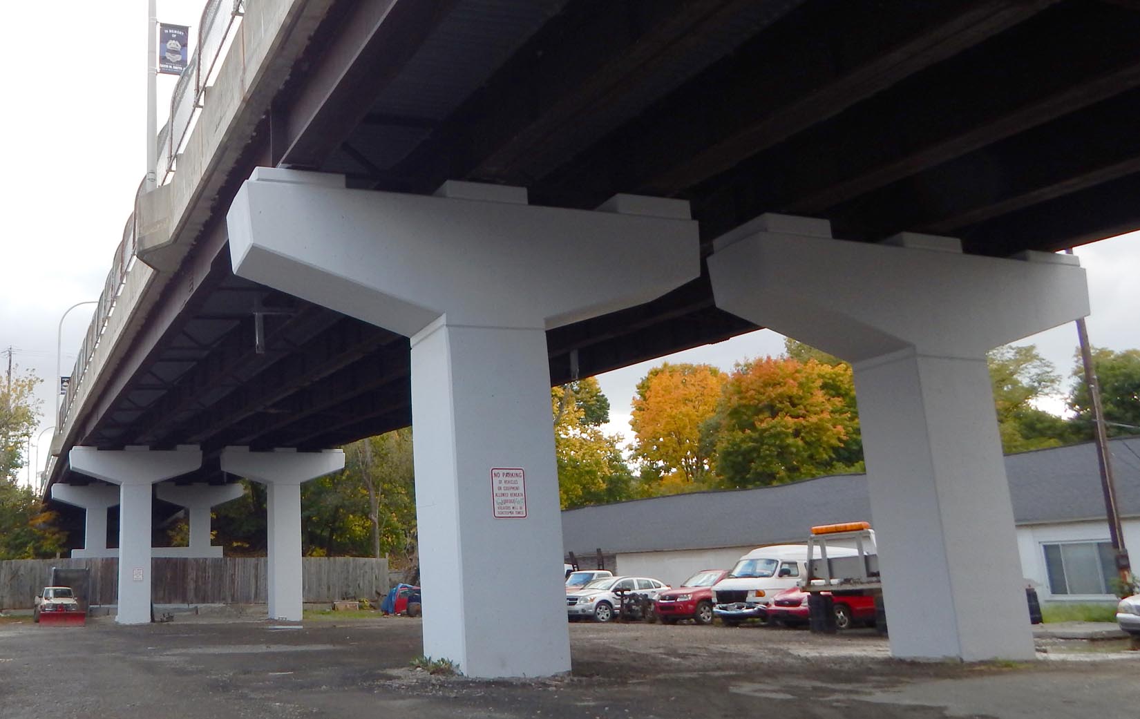 The Arch Street Bridge is a 413 ft. long, four-span multi-girder bridge with a composite concrete deck that crosses a street, creek, and active railroad in the Village of Johnson City, NY.